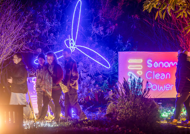 This 100 percent original, handmade light show features imaginative displays crafted by MCBG staff and volunteers. Wander through scenes sparkling with ocean waves, lighted jungle settings, shooting stars, playful jumping dogs, and a flock of flamingos. Each display is designed to enchant visitors of all ages. A treasured holiday tradition and community celebration, the Festival proudly partners with the Mendocino Coast Children’s Fund and other local nonprofits to help ensure everyone can experience the magic.